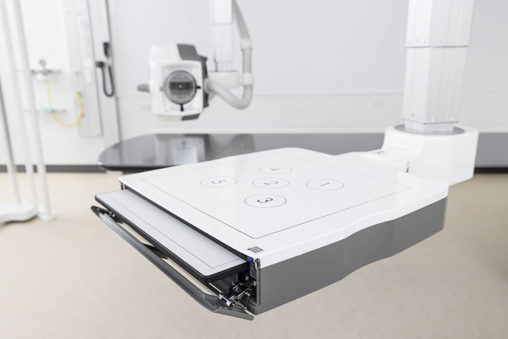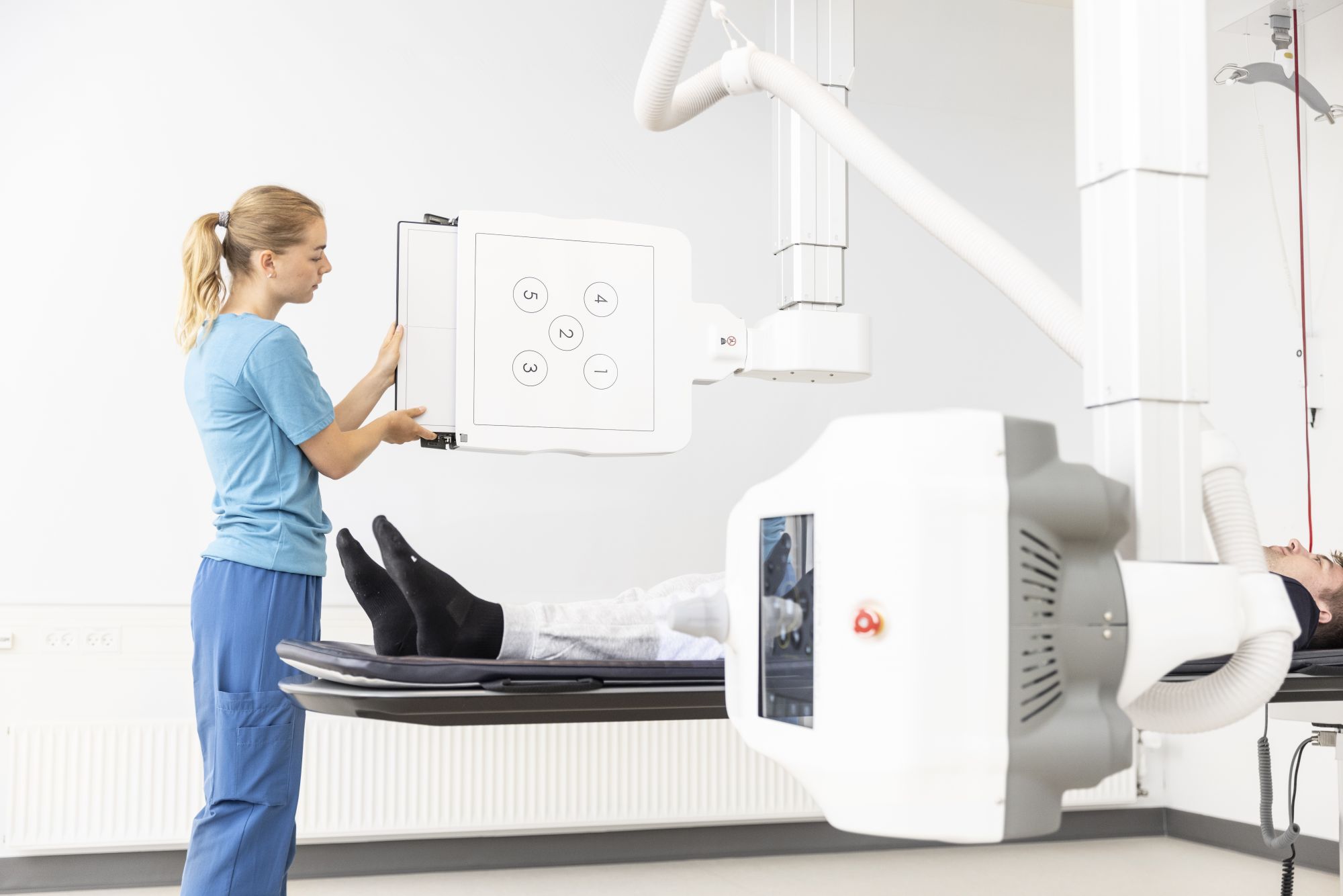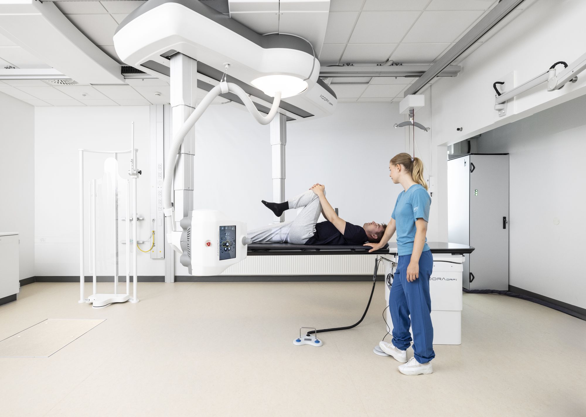 The unique positioning flexibility stems from having the tube and detector suspended in one ceiling unit rotating around its center suspension axis. The telescopic arms supporting the X-ray tube and detector dock can be positioned individually or in various tracked modes. This facilitates e.g. horizontal projections from each side of the table - enabling both right and left axial hip imaging, without repositioning the patient.